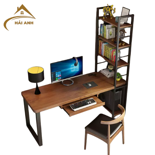Bàn có mặt gỗ rộng rãi, đi kèm khung thép chắc chắn sơn tĩnh điện chống gỉ sét, đảm bảo độ bền và tính thẩm mỹ. Bên cạnh bàn được tích hợp kệ sách nhiều tầng giúp lưu trữ tài liệu, sách vở, đồ trang trí, vừa gọn gàng vừa tiện lợi. -