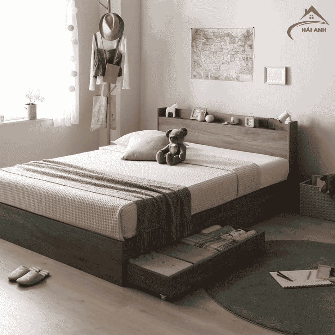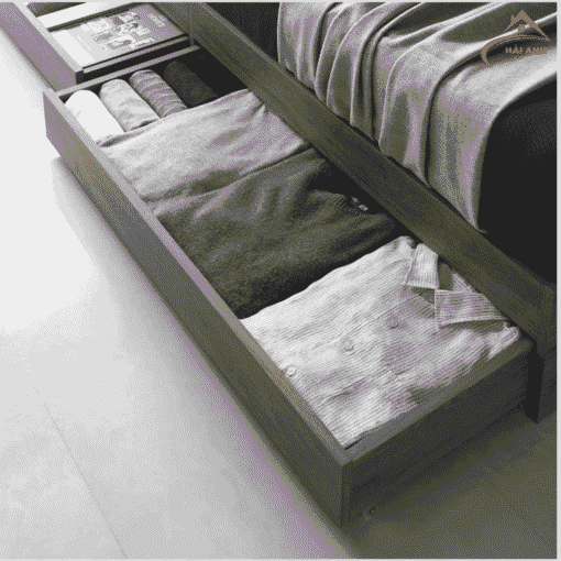 Điểm nổi bật của mẫu Giường Ngủ Gỗ MDF Sang Trọng Dễ Lắp chính là thiết kế thông minh với ngăn kéo tiện lợi ở hai bên giường. Đây là giải pháp lưu trữ lý tưởng cho những căn phòng có diện tích hạn chế, giúp bạn dễ dàng cất gọn chăn ga, quần áo hoặc các vật dụng cá nhân mà không cần tủ lớn cồng kềnh.