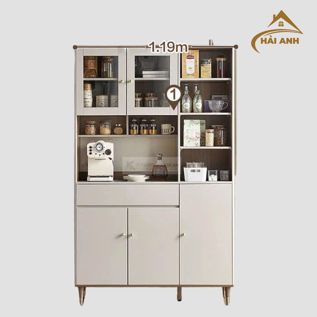Ngăn trên có cửa kính: trưng bày gia vị, trà, cà phê, rượu hoặc đồ trang trí.